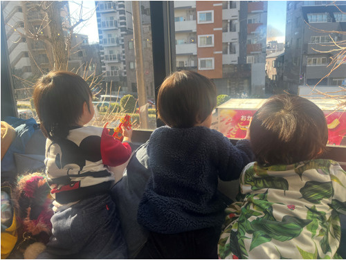 ご飯の後はまた遊ぶスペースが混んでしまってシャイ男3人は窓の外を見ることにしたみたいです(笑)